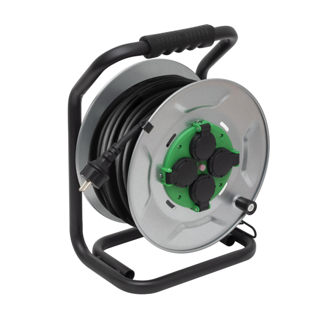 HOME HJRM2025 fém kábeldob, 25 méter, fém talp, H07RN-F 3G2,5 mm2 vezeték, 250 V~ / max. 16 A, túlmelegedés elleni védőkapcsolóval