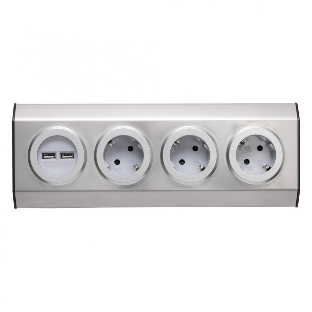 Home KNV 03/USB szerelhető konyhai hálózati elosztó USB aljzatokkal, 3 védőérintkezős és 2 USB aljzat, rozsdamentes acél, felszerelés sarokba is, max. 3680 W,