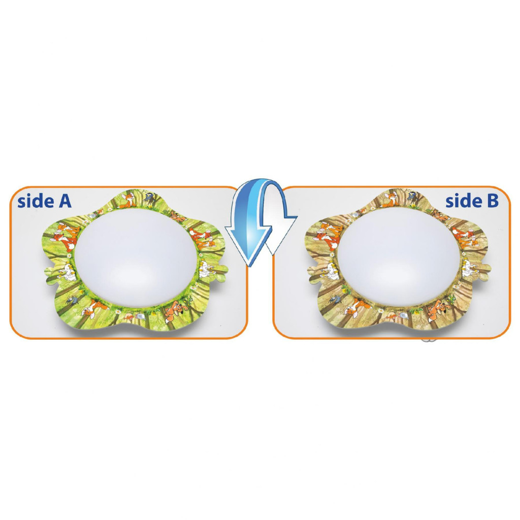 A VUK ML01 Mennyezeti ufólámpa VUK mintájú díszperemmel ellátott, ezáltal a gyerekszobákat egyedivé teheti. A műanyag díszperem megfordítható, így kedvére kiválaszthatja, hogy melyik színű perem látszódjon. E 14-es foglalattal ellátott, melyet maximum 13 W-os fényforrással lehet használni.