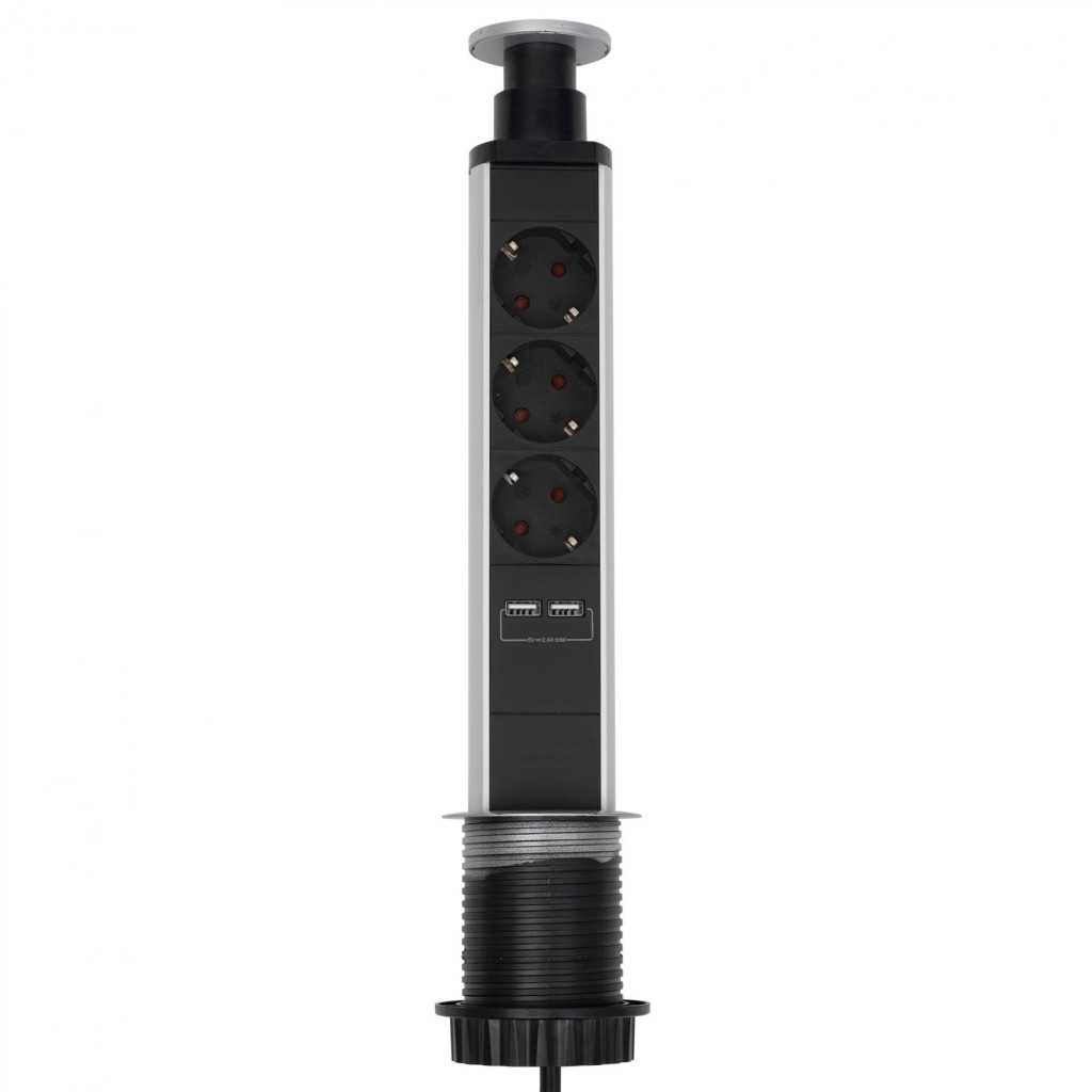 Home NVE 3/USB süllyesztett elosztó USB töltőaljzatokkal, 1,4 m, 3 földelt aljzat gyermekvédelemmel, asztalba, munkalapba építhető, süllyeszthető, max. 3680 W