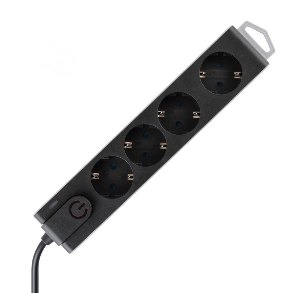 Home NVT 4K/BK túlfeszültségvédett hálózati elosztó, 1,5 m, H05VV-F 3G1,0 mm2 kábel, 4 aljzat gyermekvédelemmel, kapcsoló, felakasztható, max. 3680W, fekete