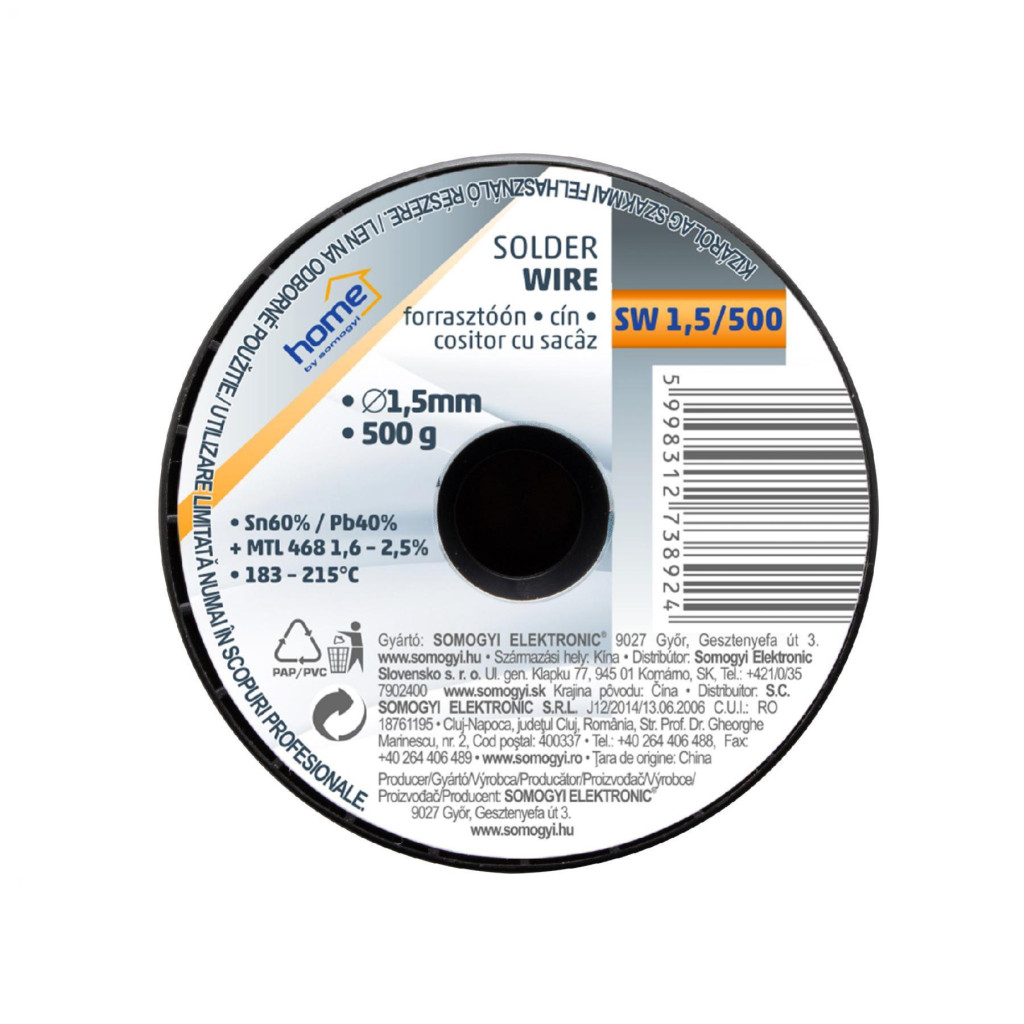 Home SW 1,5/500 forrasztóón, 1,5mm, 500g, európai gyártótól származó kiváló minőségű forrasztóón, összetétel: SN/PB: 60/40%, gyanta: 2,0%