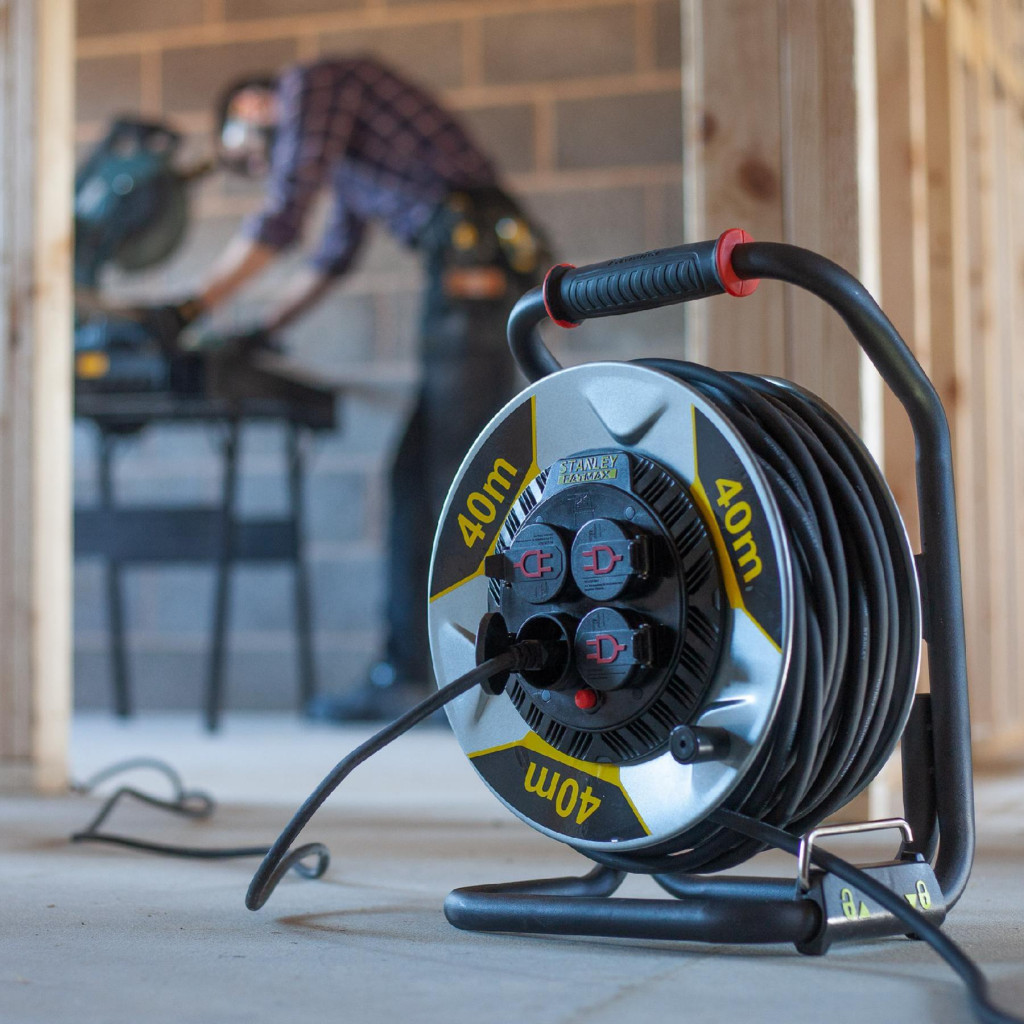 STANLEY SXECCM2FAVE kültéri fém kábeldob, 40 m, IP44-es védelem, kábelvezető, masszív fém dob és láb, H07RN-F 3G1,5 mm2 kábel, max. 3000 W