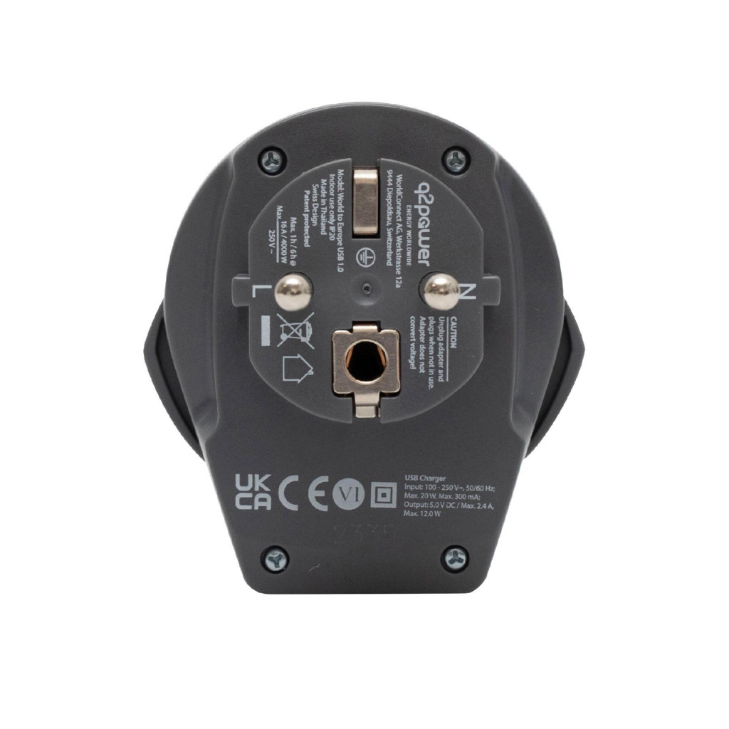 q2power 1.100110-TH utazóadapter, World to Europe USB, USB 5V 2.4A, max. 16 A, 250 V - 4000 W teljesítmény